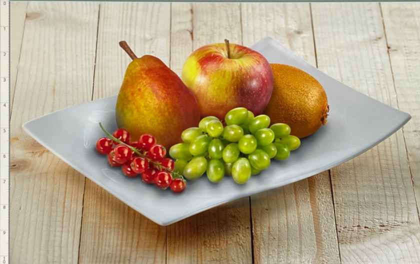 Die Bilder zeigen die verschiedenen Schritte, die ich für das Ergebnis durchlaufen bin. Besonders das Präzise ausschneiden der einzelnen Früchte war dabei recht mühselig. Den Schatten zu malen forderte viel Vorstellungskraft, da ich keine echten Früchte zur Verfügung hatte, die den Schattenwurf simulieren konnten. Da ich am Anfang nur die Farbe schwarz für den Schatten benutzt habe, wirkte das Bild am Ende zu stark und unnatürlich, also habe ich versucht als Schatten die Farben der Früchte zu nehmen, um einen weicheren Schatten zu erstellen. Der Unterschied ist dabei deutlich sichtbar (siehe Bild 5 & 6)