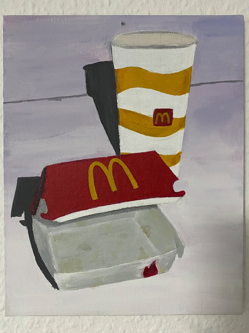 Dafür habe ich mich auf die Verpackungen von McDonalds konzentriert, die immer so mit Fettflecken versehen sind und mir für das Bild eine Nugget-Box und einen Becher von McDonalds geholt und diese genau so nachgemalt.